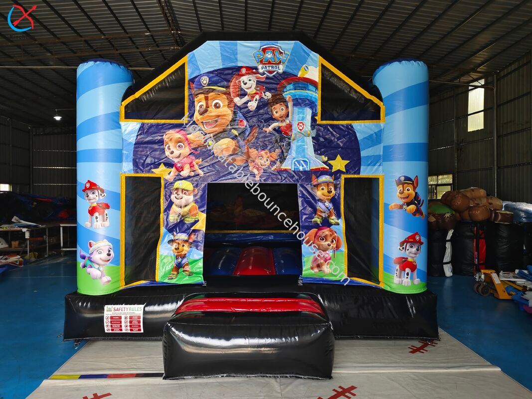 Siyah ve mavi renklerdeki Paw Patrol temalı profesyonel sınıf şişme sıçrayıcı kale, özellikle ticari kullanım ve çocuk eğlencesi için tasarlanmıştır.