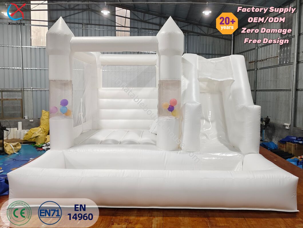 Bu zarif beyaz düğün temalı şişme zıplama evi, yerleşik bir kaydırağa sahiptir ve düğün partileri ve kutlamaları için sofistike bir eğlence çözümü sunar. Ticari sınıf yapısı, her yaştan misafir için güvenli zıplama ve kayma eğlencesi sağlar.